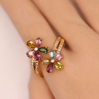 แหวนอัญมณีคริสตัลทัวร์มาลีนธรรมชาติขนาด3X5มม. ดีไซน์ดอกไม้925เงินปรับได้สำหรับเป็นของขวัญ